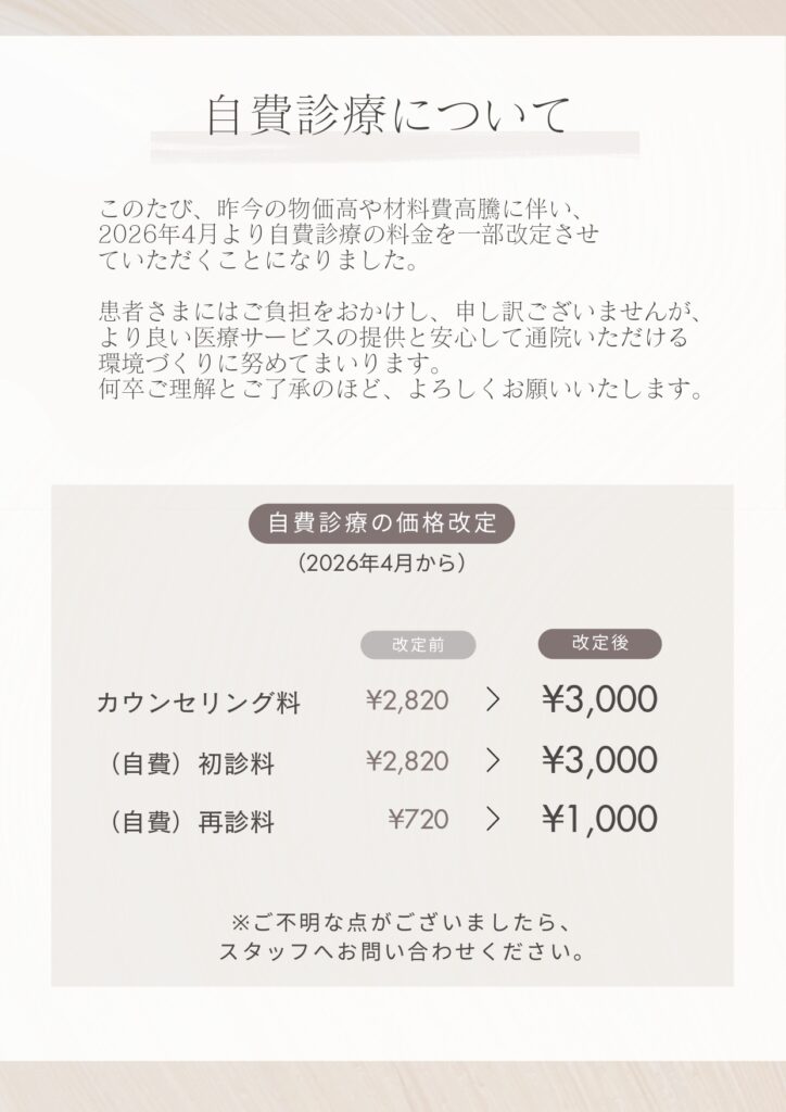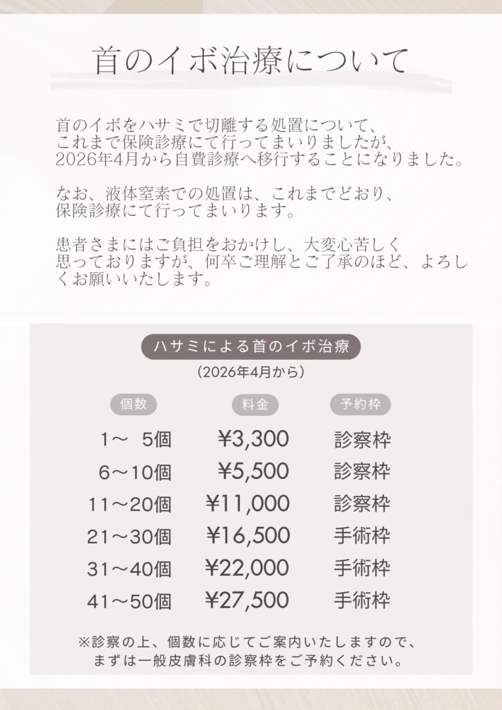 一部の診療内容と料金改訂のお知らせ お知らせ 2026/02/09 平素より、日野皮フ科医院をご愛顧賜り、心より御礼申し上げます。 この度、一部の診療内容と自費診療の料金を変更させていただく運びとなりました。 患者さまにはご負担をおかけし、申し訳ございませんが、より良い医療サービスの提供と安心して通院いただける環境づくりに努めてまいります。 何卒ご理解とご了承のほど、よろしくお願いいたします。